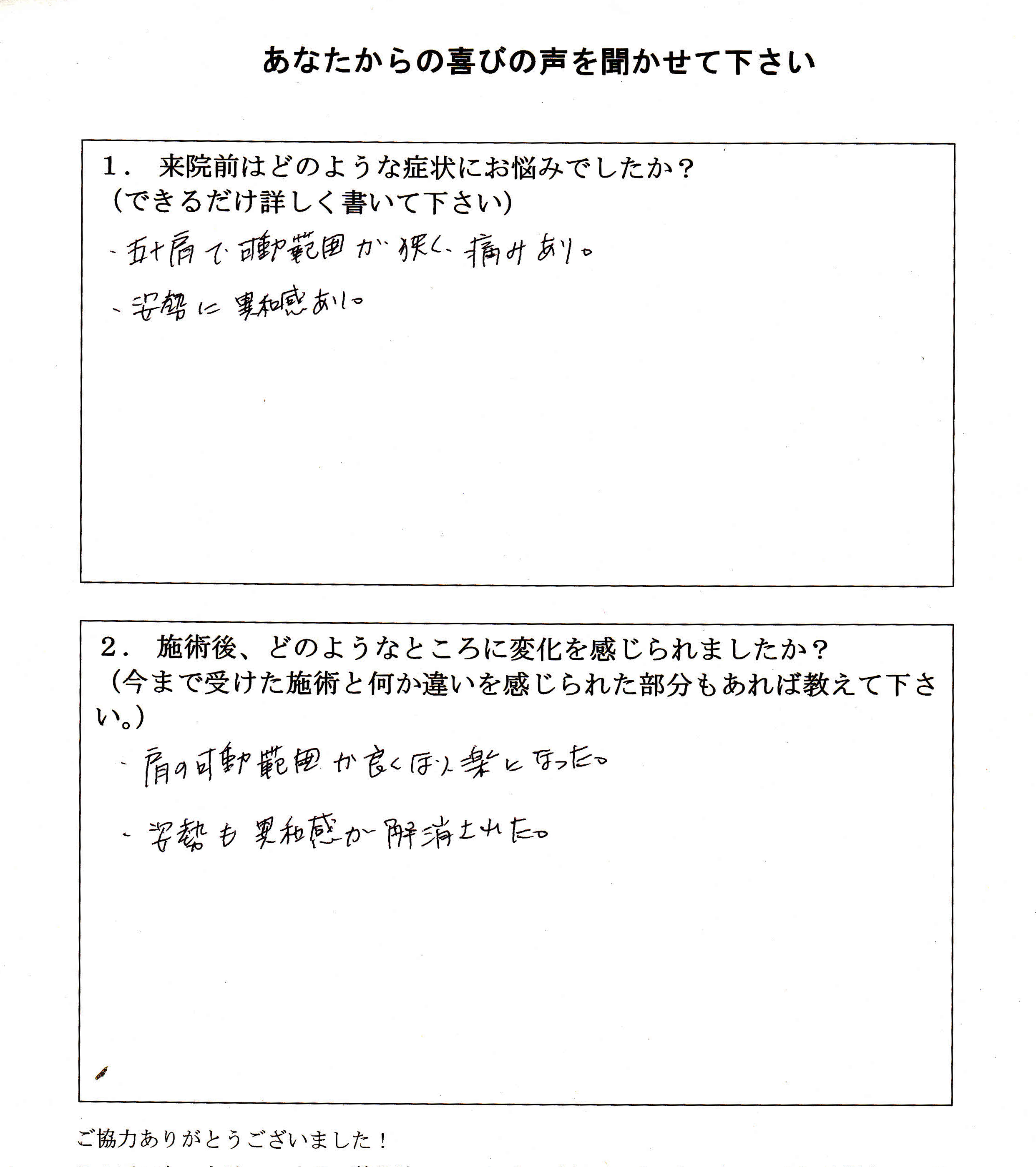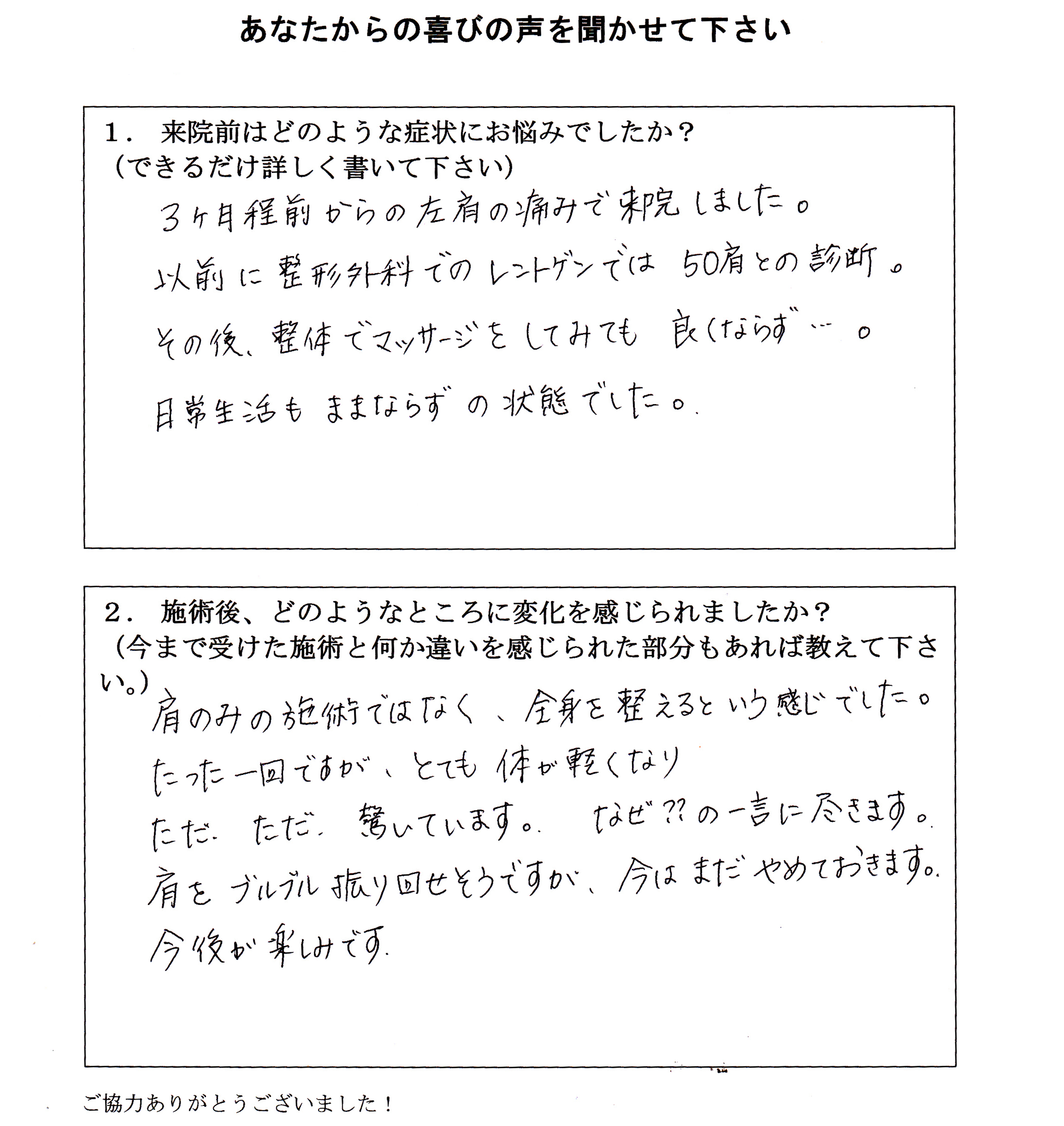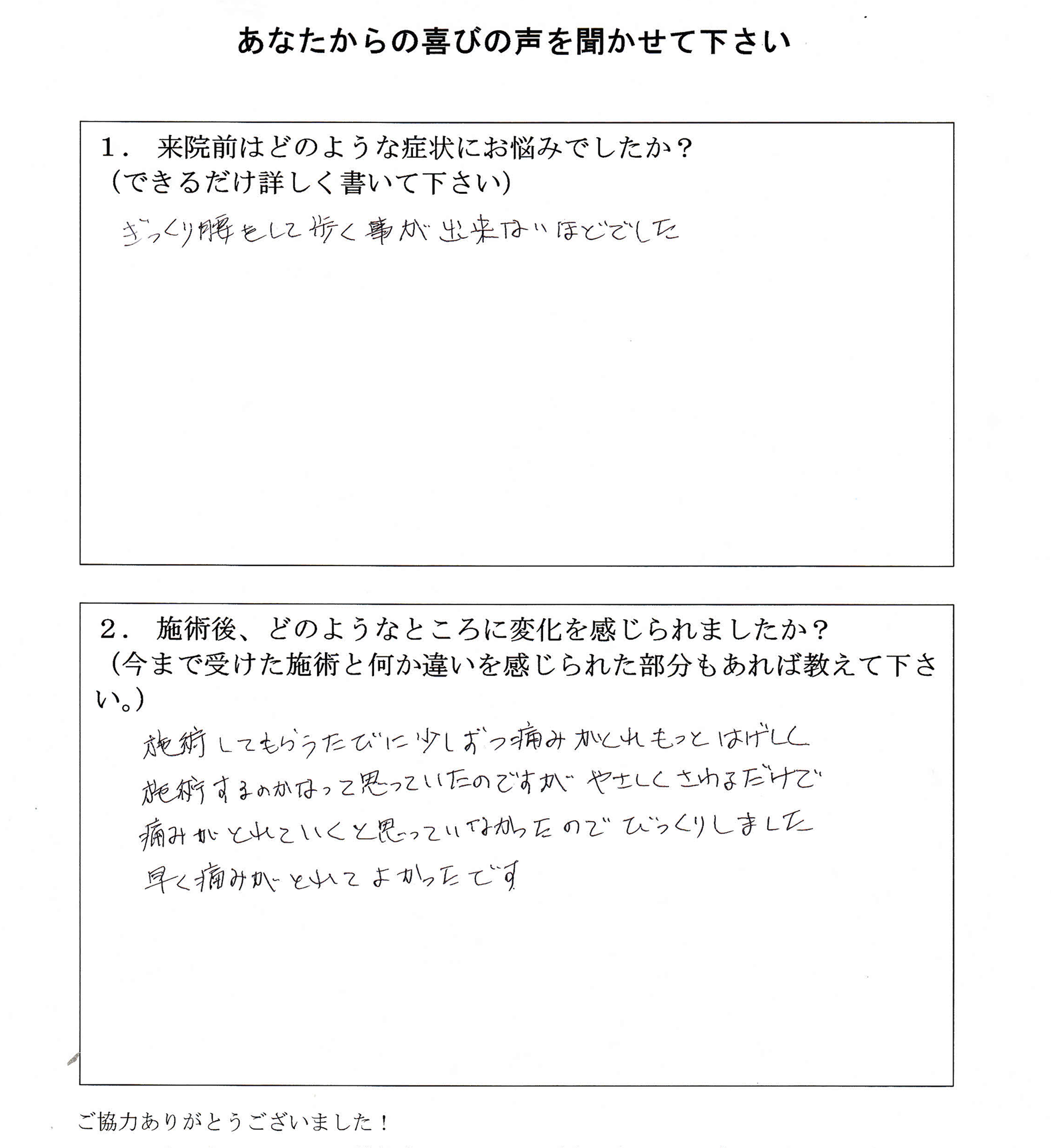 施術を受けてから、1回目の施術では、体の軽さとだるさという感じがありました。しかし腰痛は無くなっていませんが痛みが少しだけましになりました。
